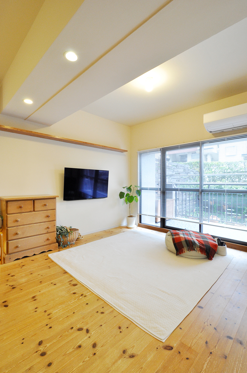 LDKは壁を取り払い、ひと続きの広々とした空間にリフォームしました。テレビは壁掛けにして視線をすっきりとまとめ、ダイニングテーブルを移動した場所にはソファスペースを新設。これまでソファがあった位置は床座でくつろげるスペースとし、家族やお子様のお友だちが集まってものびのび過ごせるリビングになりました。テレビ上部にはキャットウォーク用の棚を設け、猫ちゃんも楽しめる工夫をプラス。壁は15年前と同様に珪藻土の上塗り仕上げとし、無垢材の床と調和した、やわらかく心地よい空間に生まれ変わっています。