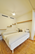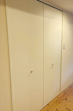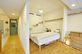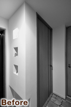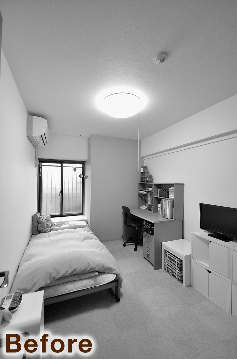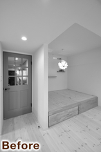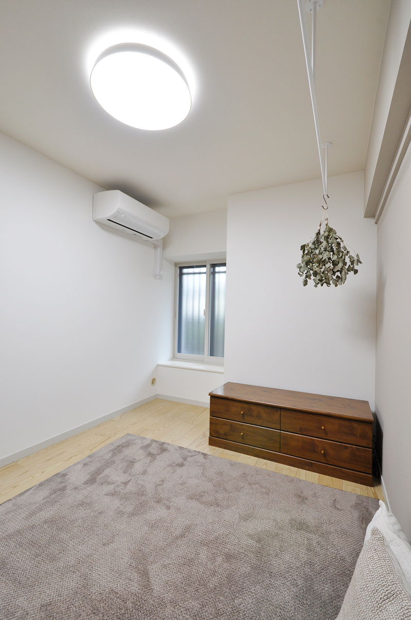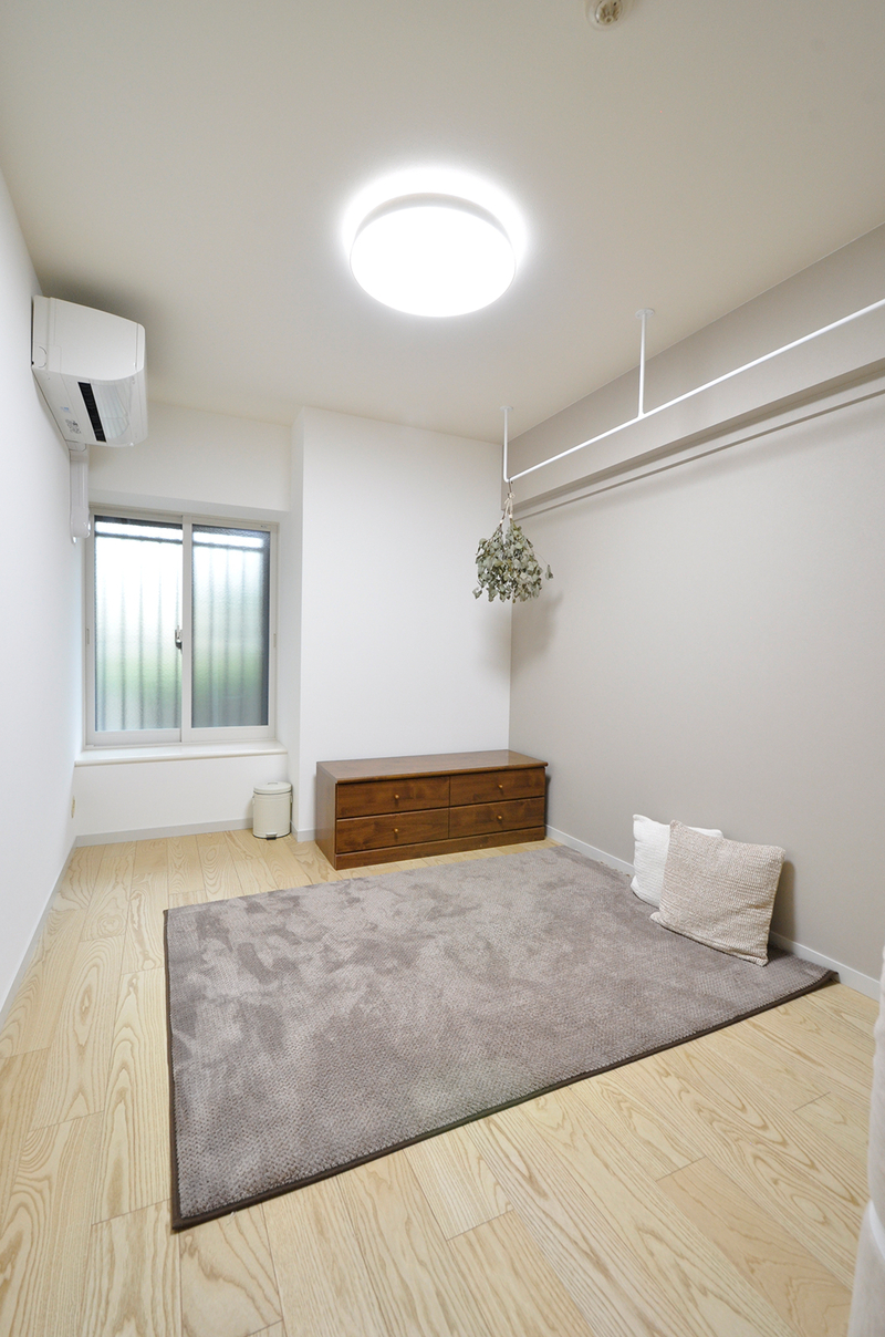 以前はカーペット敷きでお子様のお部屋として使われていた空間を、来客時にも気持ちよく使えるゲストルームへとリフォームしました。床はホワイトアッシュ柄の突き板フローリングに張り替え、明るく清潔感のある印象に。北側の窓には内窓を設置し、断熱性を高めて一年を通して快適に過ごせるよう配慮しています。壁にはグレージュのアクセントクロスを取り入れ、落ち着きのあるやさしい雰囲気に仕上げました。建具はホワイトに塗装し、空間全体をすっきりと統一。室内物干しも設け、使い勝手の良い多目的なお部屋になっています。