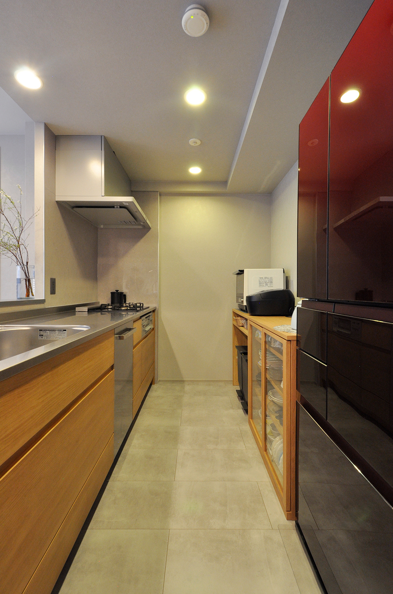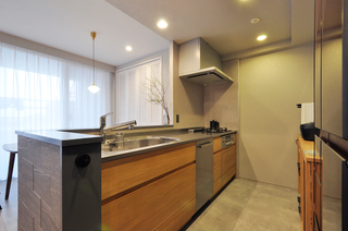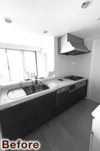 無垢材のあたたかみを感じられるウッドワン/スイージー(W=2550)へと一新。浮造り仕上げの扉がやさしい質感を生み、空間全体を心地よく包み込んでくれます。ご希望だったフロントオープンタイプの食洗機は大容量で、まとめ洗いもスムーズになりました。床材にはダイニングと同じモルタル調フローリングを採用し、無機質な風合いと木のぬくもりが調和した、使い勝手の良いキッチン空間に生まれ変わっています。