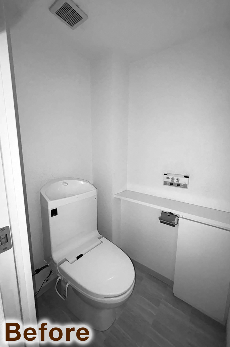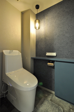 空間全体を「かっこよくしたい」というご要望に合わせ、ネイビーカラーのアクセントクロスを取り入れ、ホテルライクで落ち着きのあるレストルームへと生まれ変わりました。コーナーに設けたペンダントライトのやわらかな光と、ゴールドの紙巻器が空間のアクセントとなり、シンプルながらも上質な雰囲気を演出しています。日常使いの中でも心地よさを感じられる、洗練されたトイレ空間になりました。