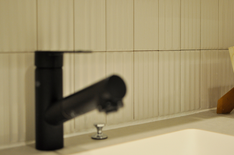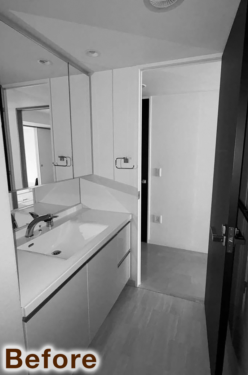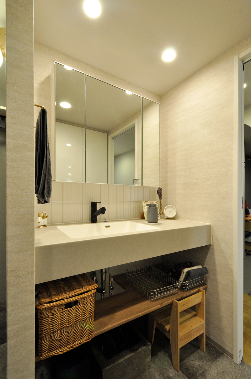洗面脱衣室は、収納や室内干しのスペースを確保したいというご要望から、間取りを見直して空間をゆったりと拡張しました。洗面カウンターにはアイカのスマートサニタリーを採用し、フロートミラーやミラータイルを組み合わせることで、抜け感のあるすっきりとした印象に。さらに、水栓や棚受、物干しパイプにはブラックの角型デザインをセレクトし、空間全体の統一感にもこだわりました。収納と物干し機能を兼ね備えた、使い勝手の良い洗面脱衣室へと生まれ変わっています。