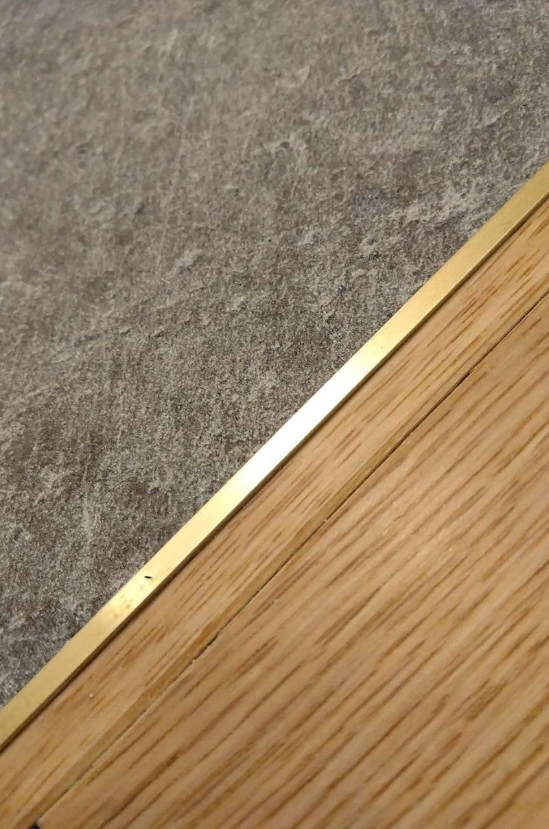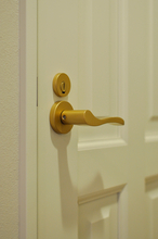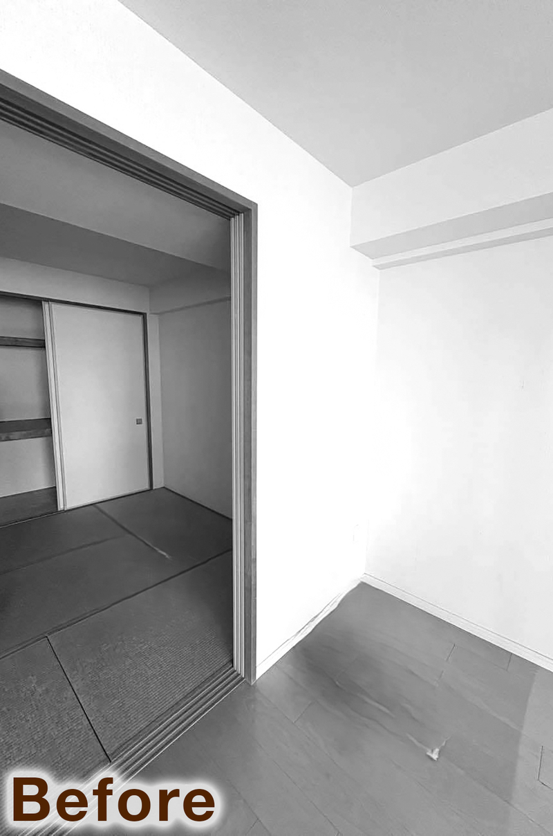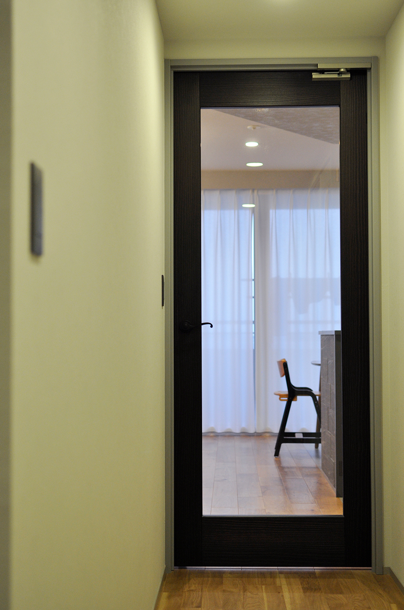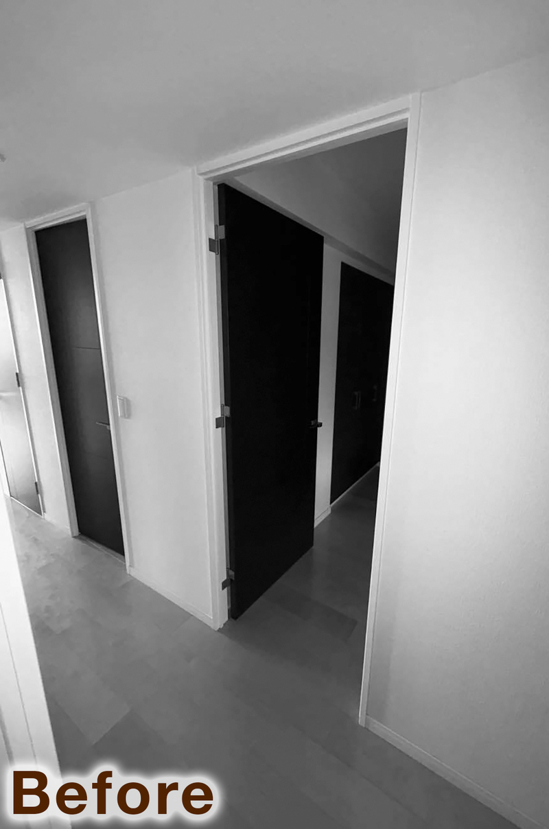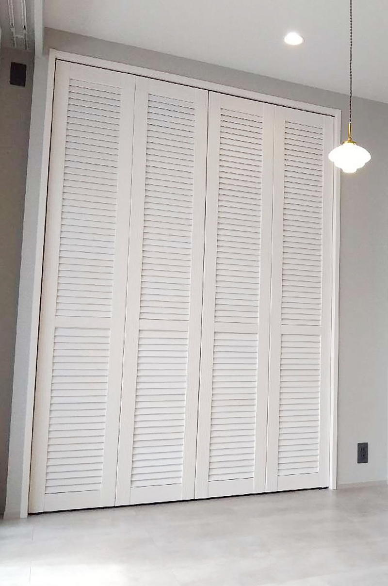 既存の建具を、奥様が一目ぼれされたウッドワンの建具へと一新しました。リビングドアには大きな透明ガラスとダークトーンのデザインを採用し、空間にほどよい重厚感をプラス。各居室はオフホワイトのクラシックな6分割デザインで統一し、やさしく上質な雰囲気に仕上がりました。さらに、ダイニング収納にはパイン材のルーバー折れ戸を採用し、柔らかなアクセントに。床見切りにはゴールドラインを取り入れ、細部までこだわりを感じられる空間となっています。