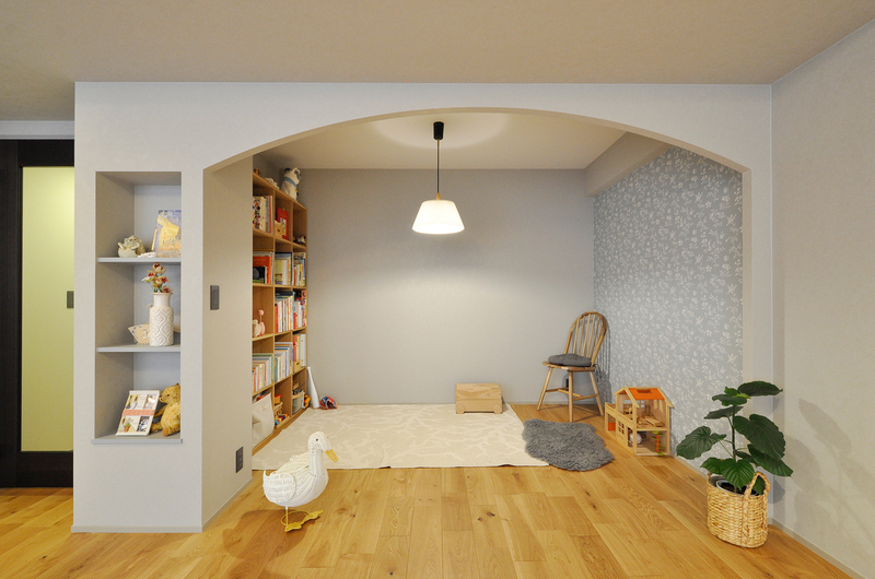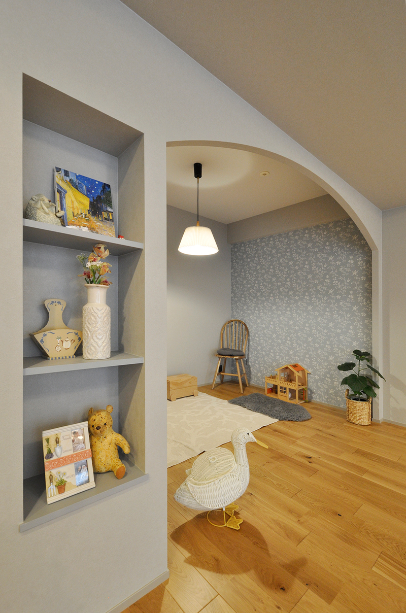 和室として使われていた空間を、リビングに隣接したセカンドリビングへとリフォームしました。大きなアーチ開口を設けることで、リビングとのつながりを感じられる開放的な空間に生まれ変わっています。可愛らしいニッチや、一面に採用したブルーの輸入壁紙がアクセントとなり、やさしくお洒落な雰囲気を演出。お子様が小さいうちはキッズスペースとしてのびのび使え、将来はカーテンなどで仕切って個室としても活用できる、ライフスタイルの変化に対応した多目的な空間になりました。