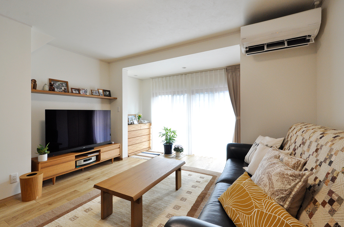 縁側とリビングをひと続きの空間にしたいという想いから、間取りと家具配置を含めて見直しました。階段下のスペースを活かしてテレビボードを移動、縁側にはチェストを配置。家具がすっきりと収まったことで、動線の確保と快適な視聴環境が同時に叶いました。光がやさしく行き渡る、広がりのあるリビングダイニングに生まれ変わり、ご家族がゆったりとくつろげる空間になっています。