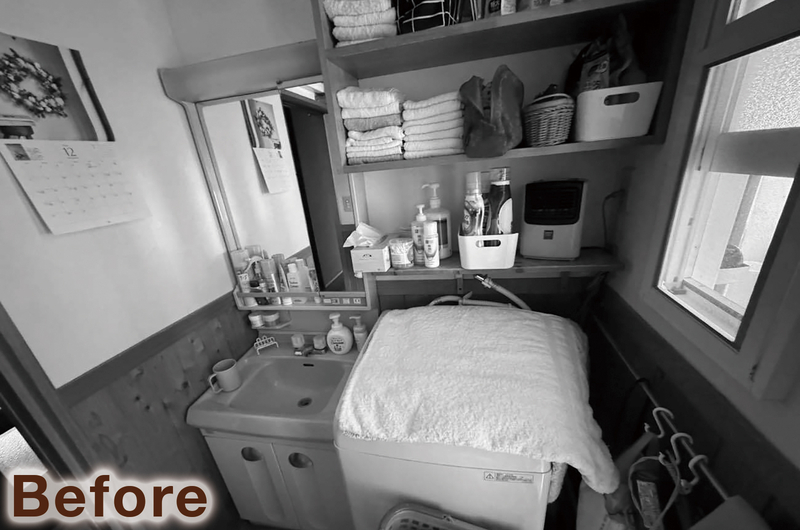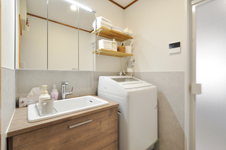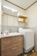 ご希望のW750サイズの洗面化粧台(TOTOドレーナ)を設置し、アンダーボウルと三面鏡で使い勝手も向上しています。洗濯機まわりはスペースを有効活用するため、脚上げで排水経路を確保しつつ、上部に収納棚を設けました。水はね対策として腰壁パネルも取り入れ、機能性と清潔感を両立した使いやすい洗面室になりました。
