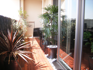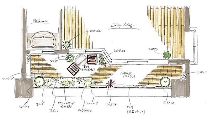 「沖縄のリゾートで過ごしているみたい。」と完成した空間を見ておしゃっていただきました。リビングから見る風景はリゾートで味わう開放感を演出し、【お仕事から帰ってくるとまずベランダでビール】という日が増えたそうです。スクリーン、玉砂利などアジアンテイストでまとめ、植栽はベランダでも十分育つものを選びました。夏の暑い日ざしも和らぎ、同時に心地よい風を室内に運んでくれます。