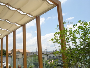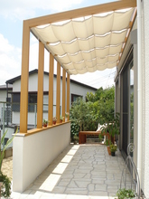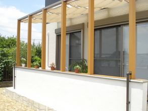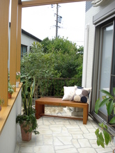 リビングを広く見せるために室内と一体感を持たせ、天気のいい日には、窓を開け放って暑い日差しを和らげてくれるパネルカーテンで快適に過ごせます。心地よい風を感じることの出来るリビングテラスが完成しました。