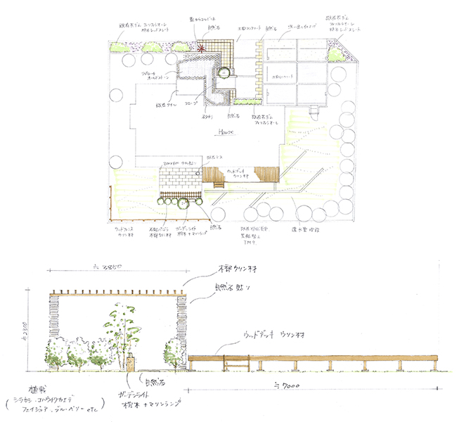 テラス・パーゴラの前には果実の成る樹やハーブを植えました。ご家族の成長とともに楽しんで頂けるかと思います。そんな緑に囲まれた空間で、ガーデンパーティーはいかがでしょうか?