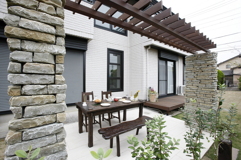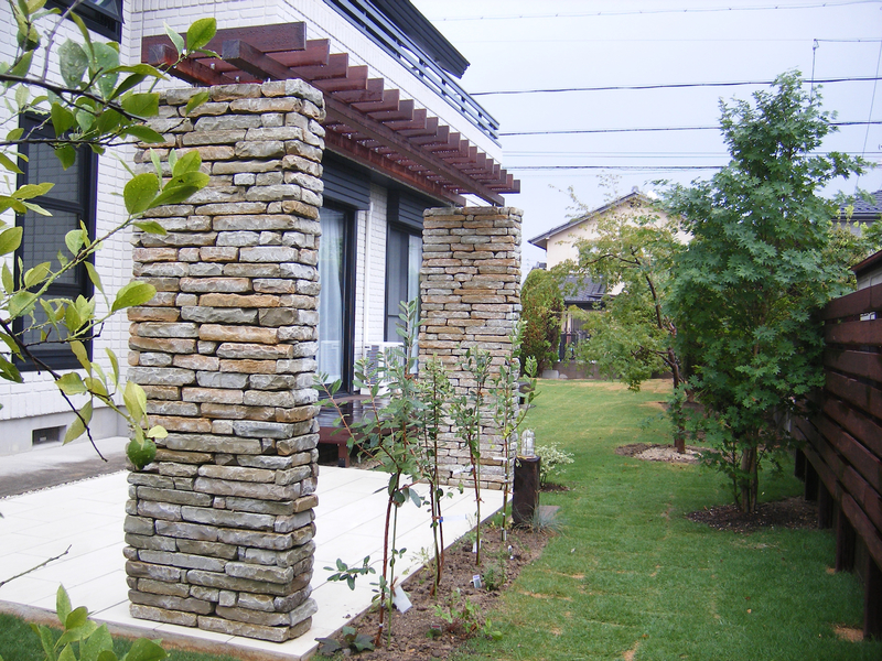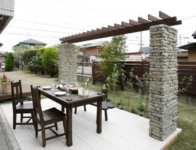 パーゴラの柱は硬質石灰岩の石貼りで仕上げ、目地を入れずにそのままの素材を活かすことで、存在感がありながらもスマートな佇まいです。