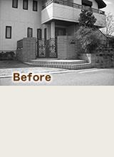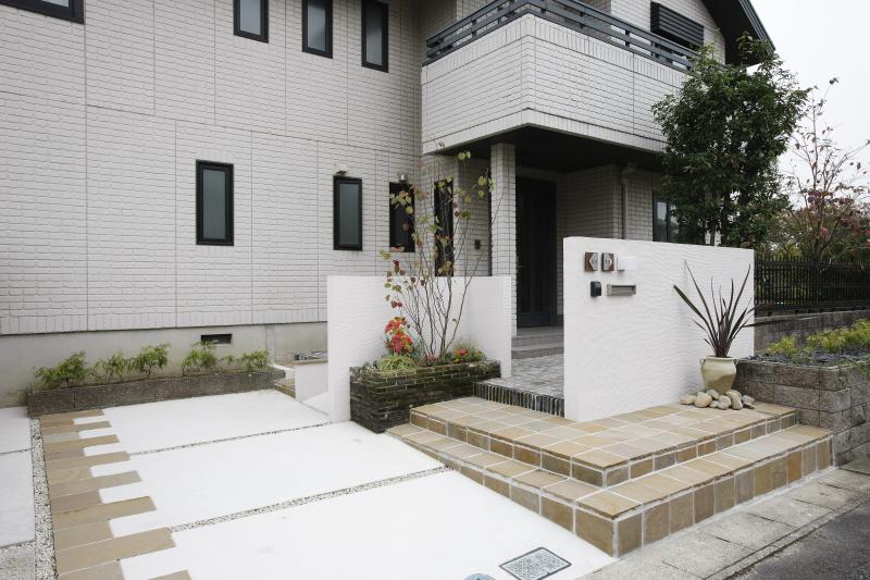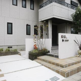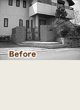 現状は高い塀に囲まれた重々しい外観で、あまり建物と調和が取れていなく、経年劣化によるタイルのひび割れなども気になり、花壇に生える雑草も悩みの種。現状クローズドタイプのエクステリアでしたが、あまり閉鎖的にせず、建物と調和を取る為にモダンなイメージでセミオープンなエクステリアにしました。