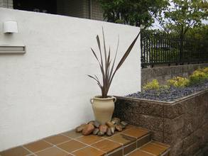 左官塗り仕上げのメインの塀の足元はL字型にステージを組みました。サイドに視線を向けるとオブジェのような [壺+植栽]が訪れる人を出迎えます。