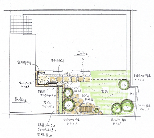 との事でした。そこで、[ 適度な開放感のあるセミクローズガーデン ]をコンセプトにお庭づくりのお手伝いさせていただきました。