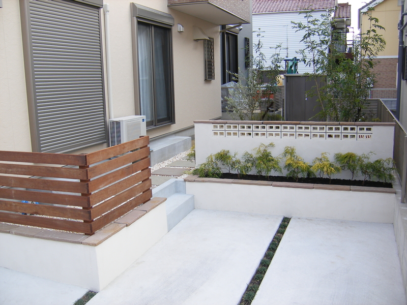 駐車場と庭の仕切りに 『左官塗り仕上げ』 + 『デザインブロック』 の塀を設けました。高さは道路からの視線が気にならない程度にすることで、お庭に圧迫感を与えず、広がりを持たせました。既存の塀との間は、花壇を作り駐車場からも緑を楽しめるようになりました。