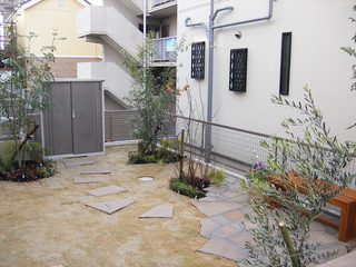 テラスでの余りの石を飛び石風に。プランには無かったものでしたので、とても喜んでいただきました。植栽には半常緑樹のシマトネリコ、シラカシ、オリーブを。落葉樹はジューンベリー。緑の葉がさわやかにそよぎ、楽しめる木々たちです。