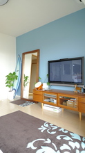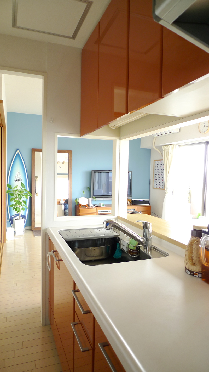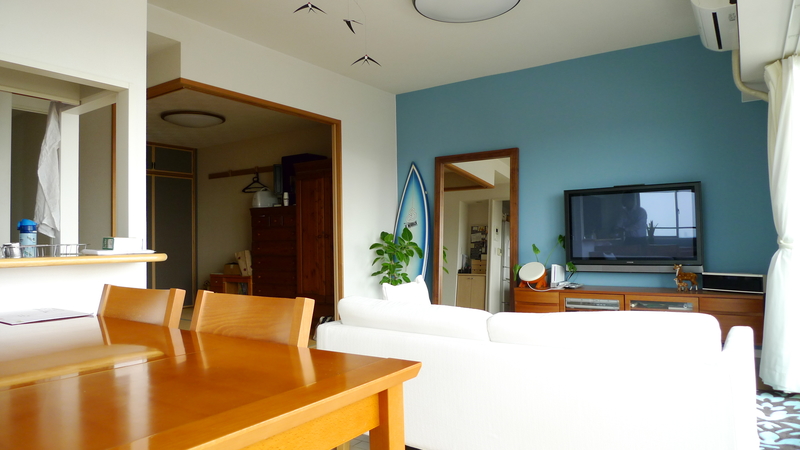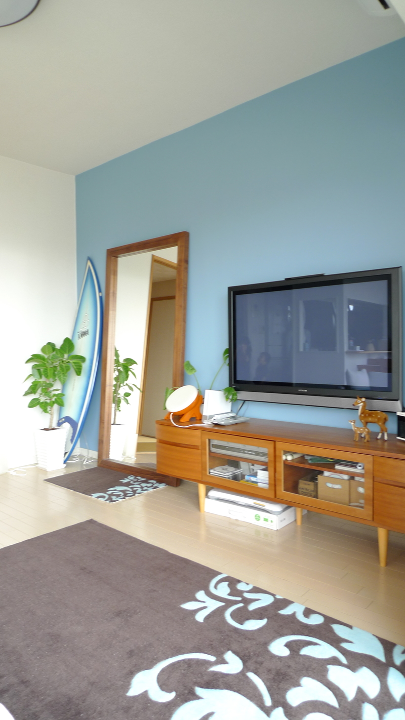 壁の一面を“家族が大好きな海”の色とする事で、部屋のアクセントになるとともに空間にメリハリも出来ました。ご主人の大切なサーフボードや観葉植物のグリーンもとても映えます。魅せる壁として生まれ変わりました。