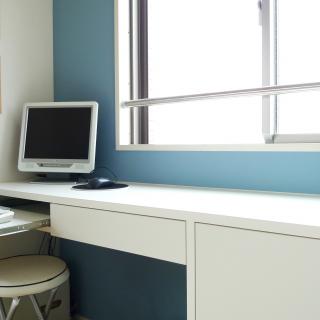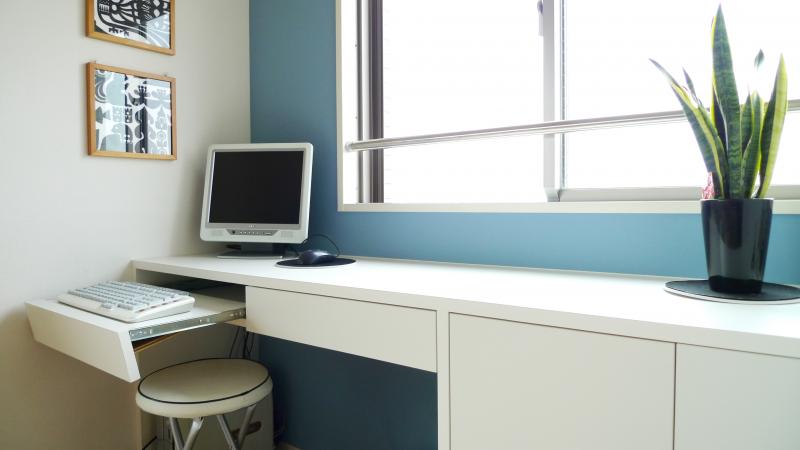 収納兼パソコンデスクは、ご家族の要望を元にオーダーメイドしました。パソコンを使用しない時には、引き出しにキーボードを隠せるデザインとしましたので、とてもスッキリとしています。右側の収納は、可動棚とし、入れる物によって高さを調整頂けるようしました。