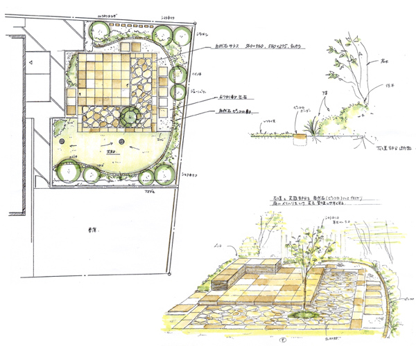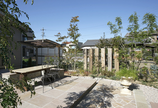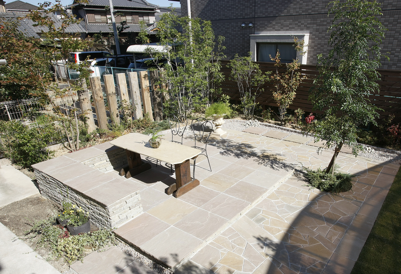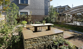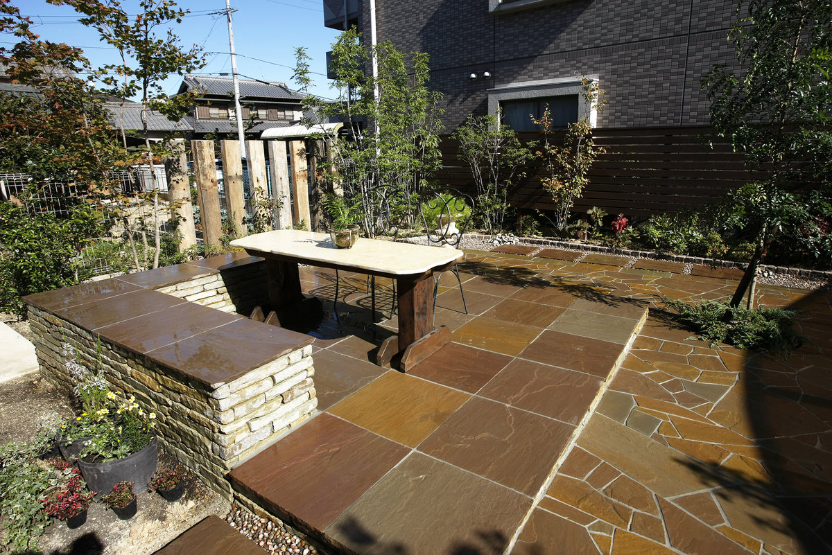また表情豊かな自然石で作るテラスは、時間とともに趣を増し、訪れる人を楽しませてくれます。樹木が目隠しになり、思い思いの時間を過ごす【もう一つのリビング】として、ご家族の皆様とともに成長していくお庭になりました。