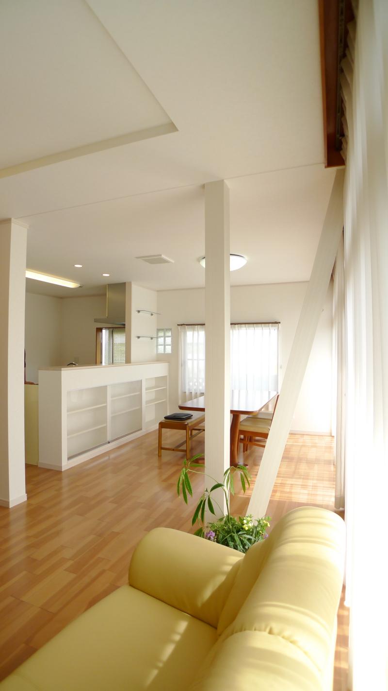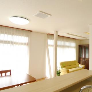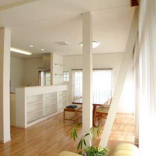 構造上撤去出来る壁は全て取り払い、必要な柱や筋交はデザインとして取り入れ視界を遮らない広々とした印象のLDKになるようプランしました。キッチン横の壁を残すことで、コミュニケーションを確保しながらも視線は遮るオープンすぎないスッキリとした空間となりました。