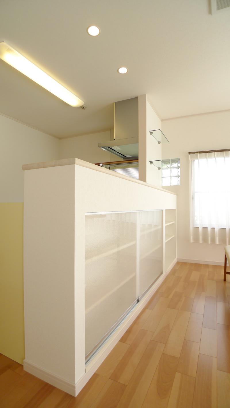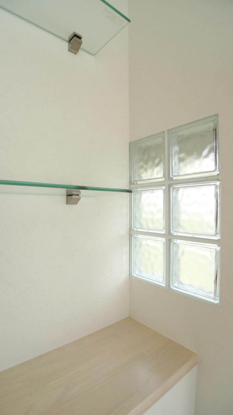 出窓部分にかかる壁は、I様の「解放感・明るい空間」を実現する為、ガラスブロックをはめ込み、お部屋のアクセントにもなりました。