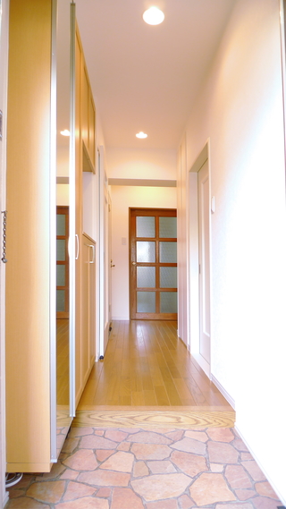 フロアで統一感を持たせるためタイル調の床に。姿見付の玄関収納を設置し、娘さん達のお出掛け前チェックには欠かせない場所に。