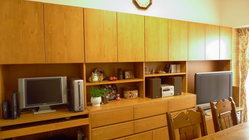 今回、オーダーメイドの壁面収納家具を設置する事で、スッキリしたリビングに。収納扉には耐震ロックを付け、地震への不安も解消しました。TVボードは可動式とし、状況に合わせて見易い位置に移動出来る工夫もしました。