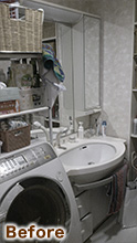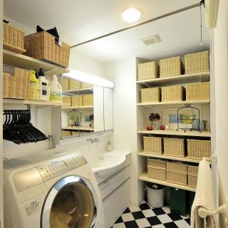 収納バスケットの高さに合わせて調整ができる可動棚を洗面右と洗濯機上に新設。