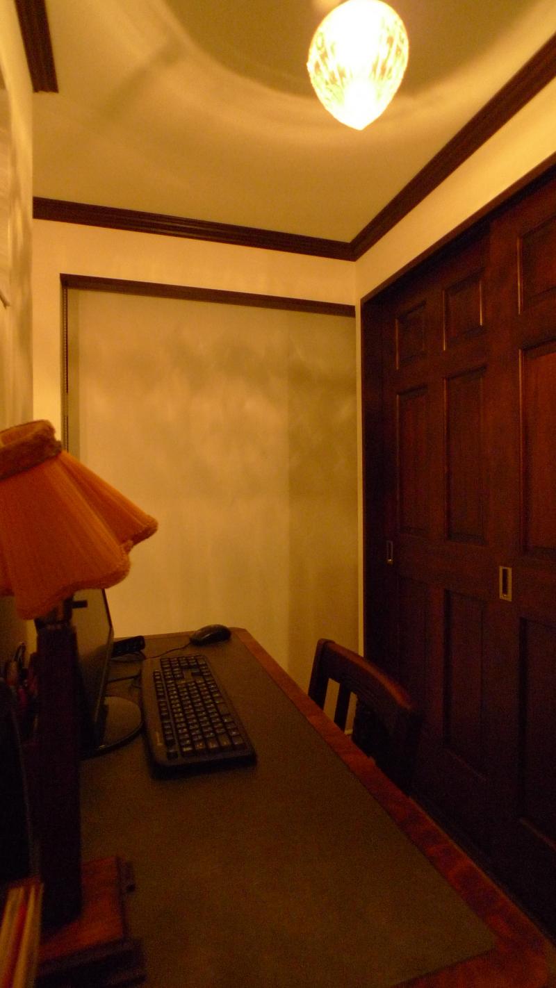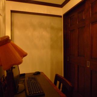 仕切り壁以外は開放。仕切り壁には、ステンドグラスをはめ込み、空間のアクセントと共に明るさと開放感をプラス。書斎背面と側面には、大容量の収納を設置。大量の本・パソコン周辺機器もスッキリ収納。