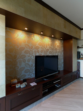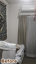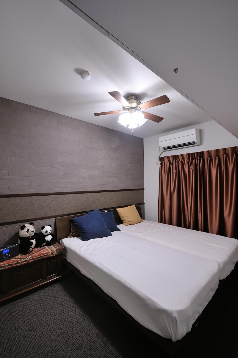 ベットや家具・カーテンに合わせてカーペットと壁クロスの一部をシックな色合いにし、落ち着きのある寝室に。エコカラットで夏の湿気や冬の結露も緩和できます。