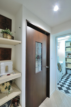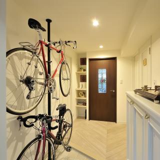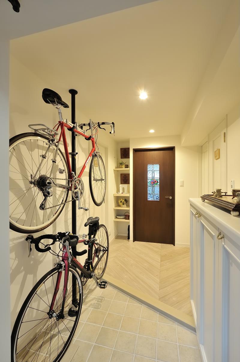趣味の自転車がかっこよく並ぶ玄関は、洋室との壁を約45cm動かしてスペースを拡張。わずかにできたニッチは飾り棚に。白色をメインに明るい空間へとリニューアルしました。