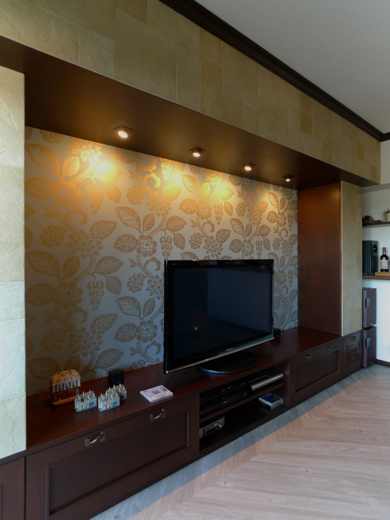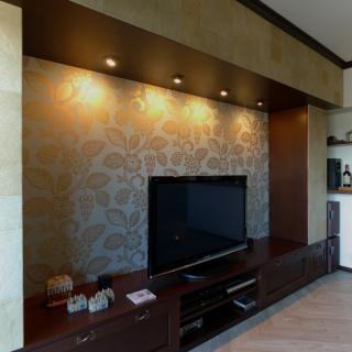 リビングに造作したオリジナル家具。マンション固有の梁や柱による凹凸を逆に利用し、テレビボード兼収納スペースを造作。