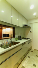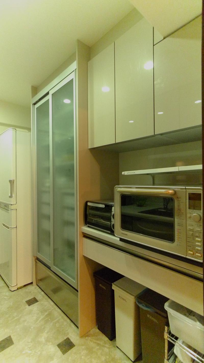 メンテナンス性と収納重視のキッチン。梁型と収納する物の量・サイズを考慮しスッキリ空間に。袖壁に入れたステンドグラスと床材で、お部屋との統一感を出しています。