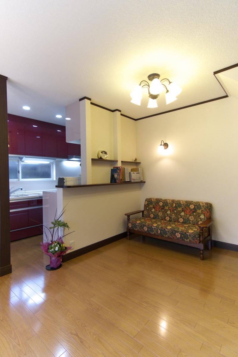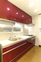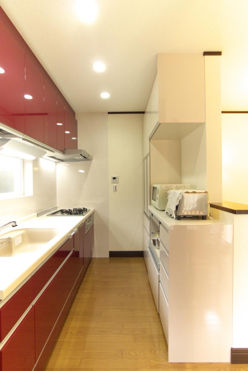 新しく生まれ変わったキッチン。現在ご利用中の調理器具・キッチン家電をお聞きしながら、使い勝手良く、収納も十分に確保しました。色は奥様の好きなワインレッド。空間をシックにまとめてくれます。