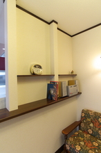 リビング側のカウンター上部は壁の厚みを利用し、高さが変更出来る棚を造作。ご夫妻のお気に入りの品々を飾るスペースに。
