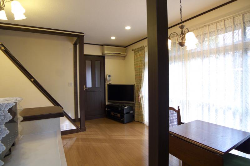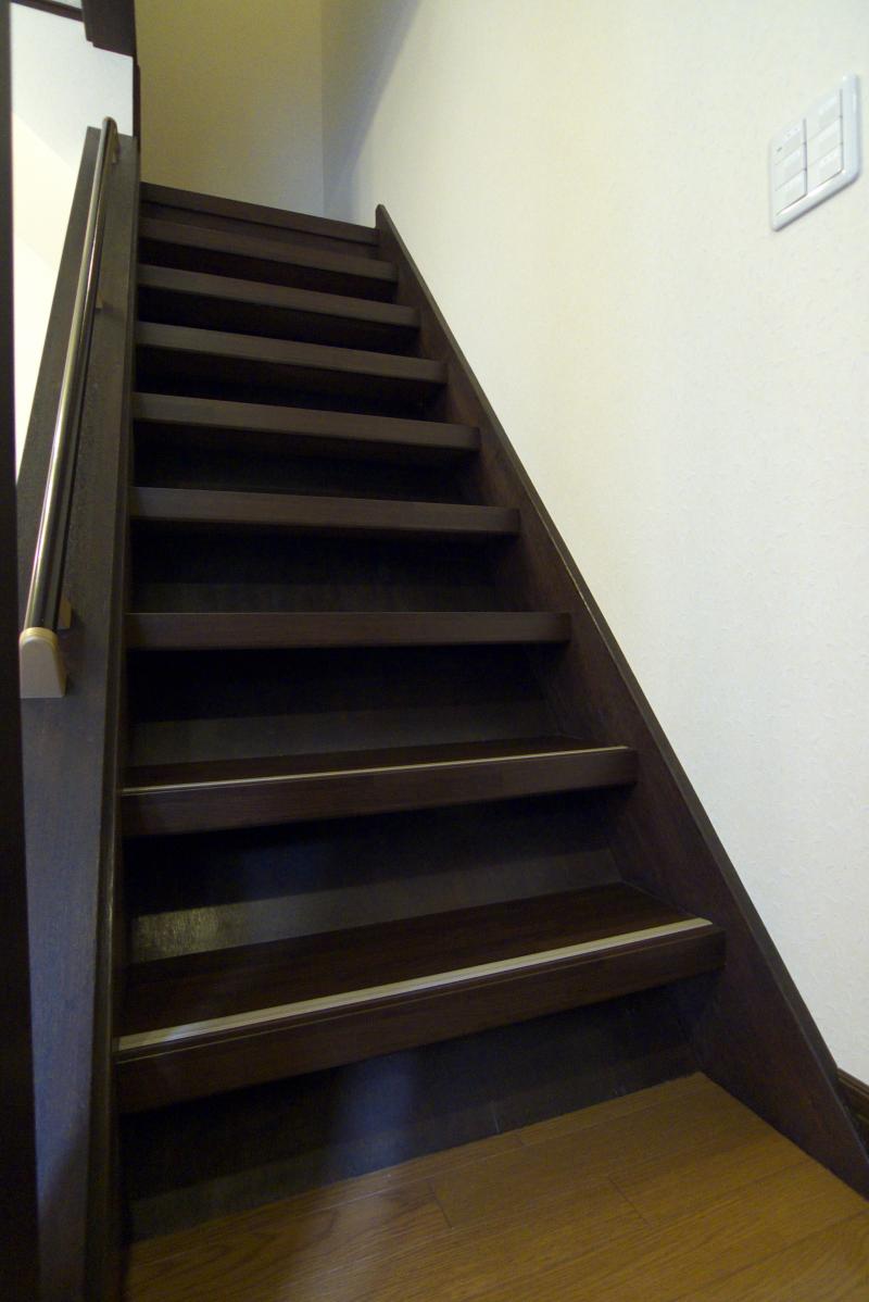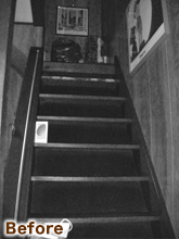 K様邸のリビング階段。ワンちゃんの噛み跡があり、以前から気になっていました。現在の階段を生かしつつ、部屋の雰囲気を崩さない方法を模索。踏み板の部分にリフォーム階段を被せる事で重厚感を出しました。他の部分は塗装を施し、部屋全体のイメージと合った階段に変身。