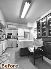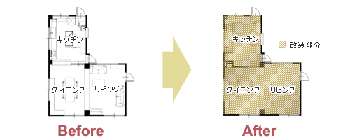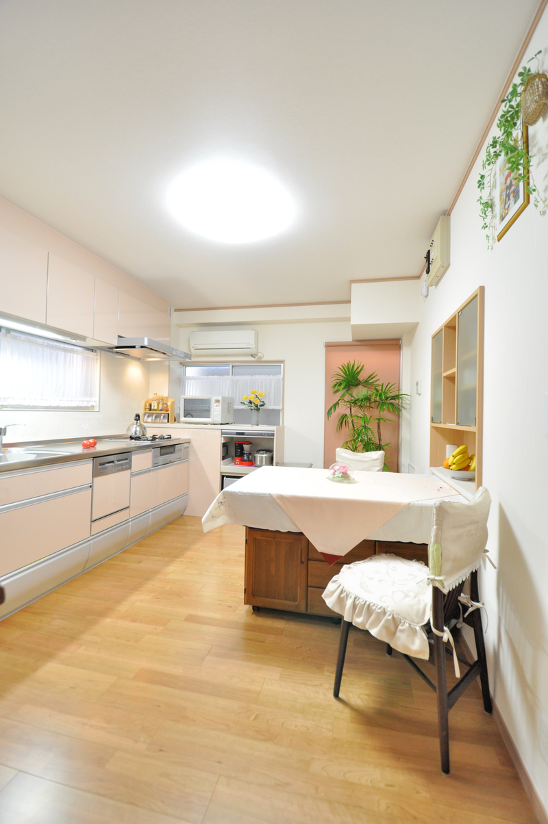 フォーム前より十分に余裕をもったキッチンスペースでしたが、使いづらいと奥様。まず、お手持ちの食器・調理器具・家電製品をヒアリング。キッチンでの導線も検討。結果、キッチンはあえてサイズダウン。そしてデッドスペースはなくし、収納力をUP。キッチンと家具・家電の位置を整えることで、動線も短く、スッキリとした配置となり、作業性も大幅に向上しました。