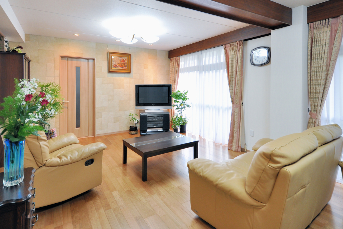 明るく生まれ変わった空間。既設の梁や天井、お気に入りの家具・カーテン、随所に配されたドライフラワーやグリーン。床暖房の敷設で年中快適な空間となりました。