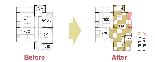 | リフォーム箇所 | LDK(一部減築)、玄関、トイレ、浴室 |