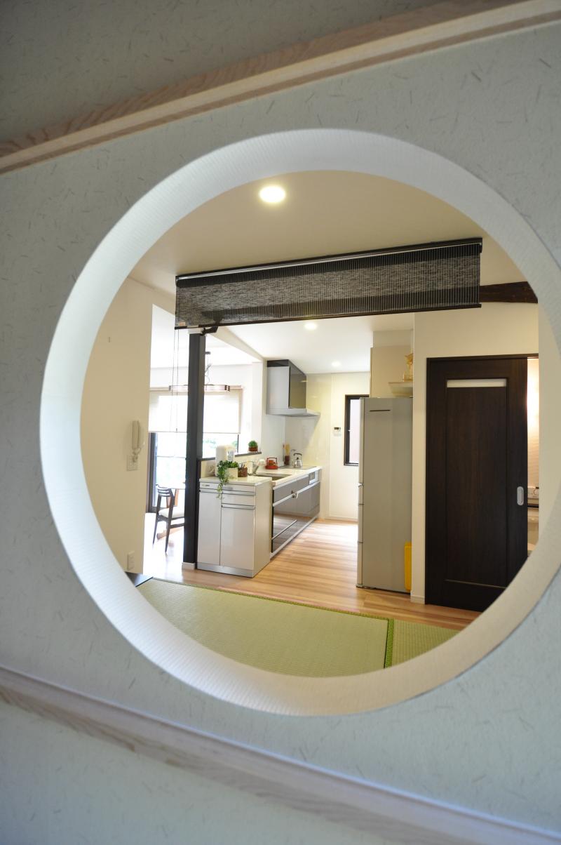 和モダンなお部屋のアクセントになればと丸型にしたところ、遊びに来たお友達が入ってすぐに「何これ?素敵!」と口をそろえて言って下さるそうです。奥様にも「リフォームの中でこの丸窓が一番気に入ってる」とおっしゃっていただきました。