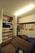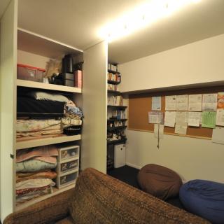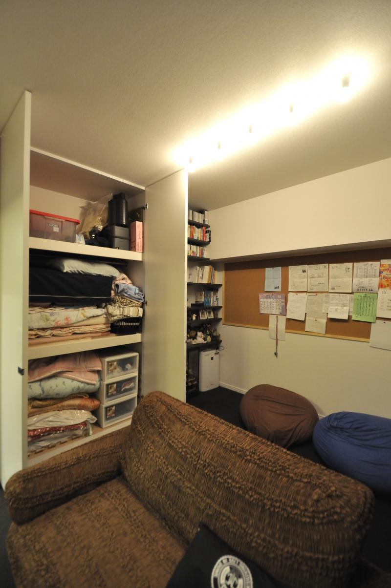 生活空間を少しでも余裕あるものにするためにリビング収納は、天井いっぱいまで使えるように造作。特注のコルクボードは横240cm×縦90cmと超ビックサイズ!! これなら学校から配られる様々なプリントもバッチリ貼れます。