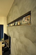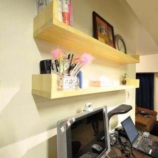 ポーターズペイントで仕上げた壁に棚を設けて、家族のフォトフレームをいっぱい飾ります。