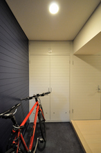 玄関の壁は、一部をネイビーブルーに塗り替えアクセントに。床のタイルも貼り替え、ご主人様の自転車が映える、趣のある玄関となりました。