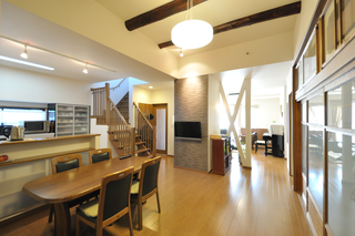 いつも家族の気配が感じれるダイニングキッチンは、玄関ホールの階段を取り込み、奥様が料理中でも家族の送り迎えができます。