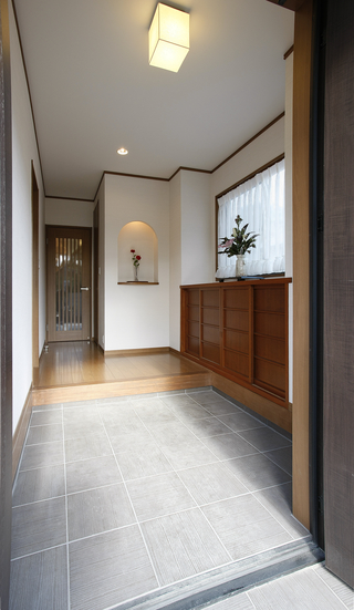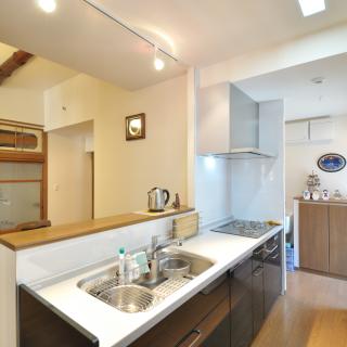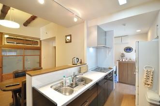 「床暖房でキッチンは寒さ知らず。満足です。」と奥様。一直線上に玄関があるので、料理中でも家族を見送り迎えられます。