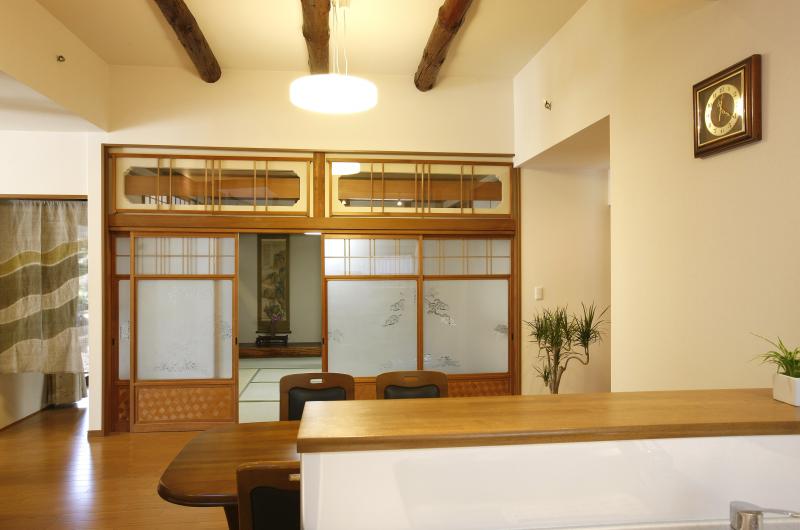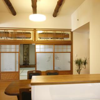 歴史を感じる和室のガラス障子や、天井裏から出てきた丸太の梁は、ダイニングのインテリアとして活かしました。