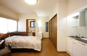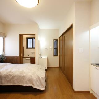 1階の増築部分はお母様のお部屋。ミニキッチンやトイレ、専用の玄関も完備。「引き戸を開け放しておくとリビングやダイニングキッチンにいる家族の声も聞こえるので安心です。」とお母様。