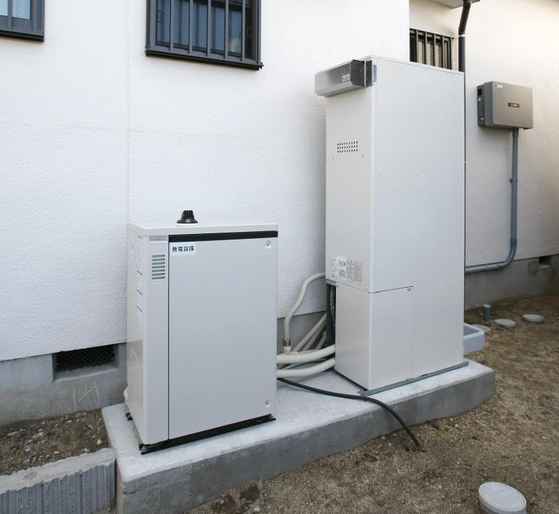 昼間は太陽光で発電。耐震面を考慮し、ソーラーパネルは増築部分に設置。 夜間はガスで発電して電気料金を大幅ダウン。発電の排熱でお湯も沸かせて温水床暖房にも活用できます。