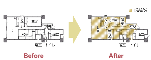 | リフォーム箇所 | リビング、ダイニング、キッチン、寝室、子供部屋、洗面所、トイレ、玄関ホール |
