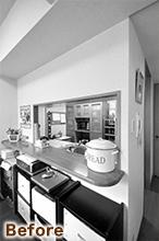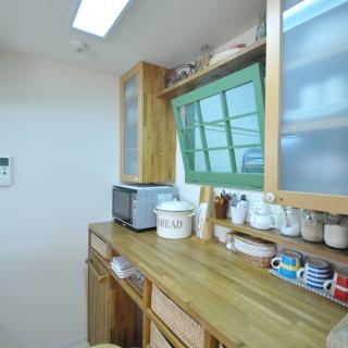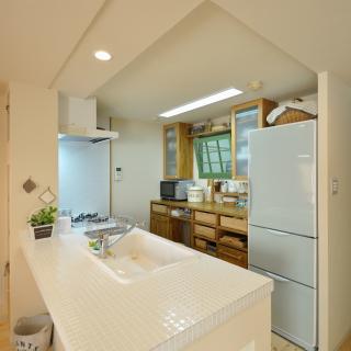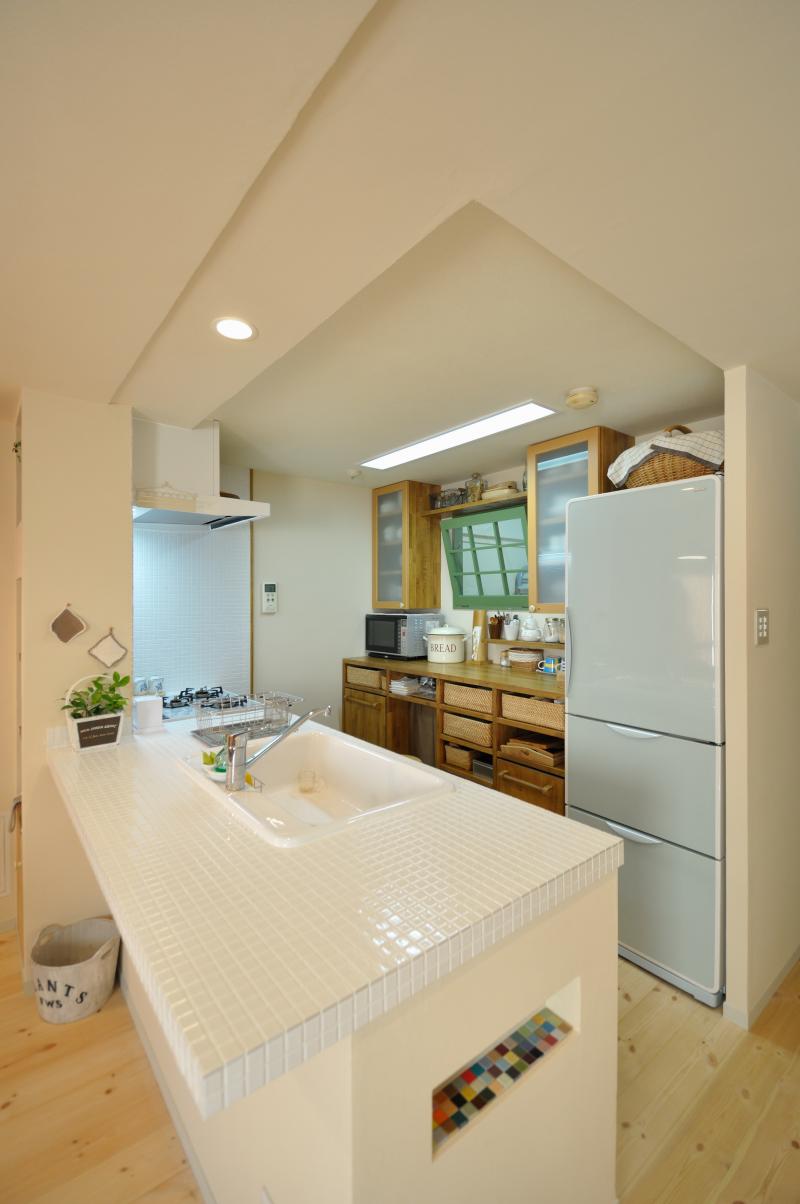 開放的なオープンキッチンは、壁を撤去し、天板は優しげな白いタイル仕上げ。まだ使用できる本体は再利用、シンクとレンジフードだけ交換してコストを抑えながらも個性的に変身~!!