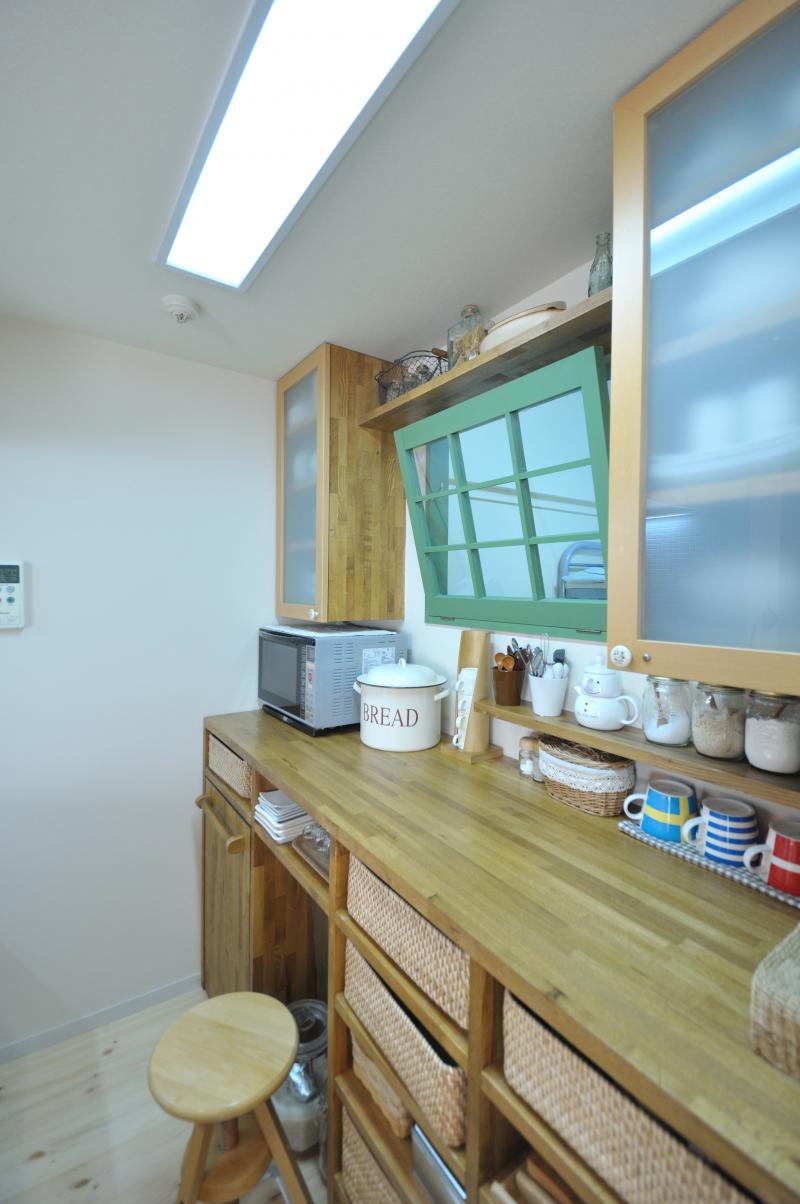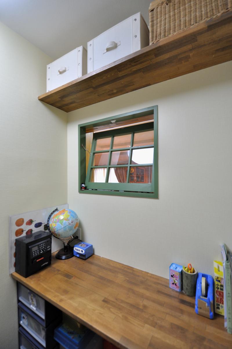 キッチン背面に造作したグリーン色の窓は、隣の子供部屋と繋がっていて、いつでもコミュニケーションがとれます。暗くなりがちな真ん中の部屋の明り取りにも。