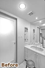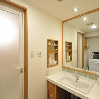 木の温かみ感じられる洗面所は、洗面ボウルを取り替え、前板や枠をリメイクして雰囲気を一新!引き出しやミラーは再利用してコストダウン。